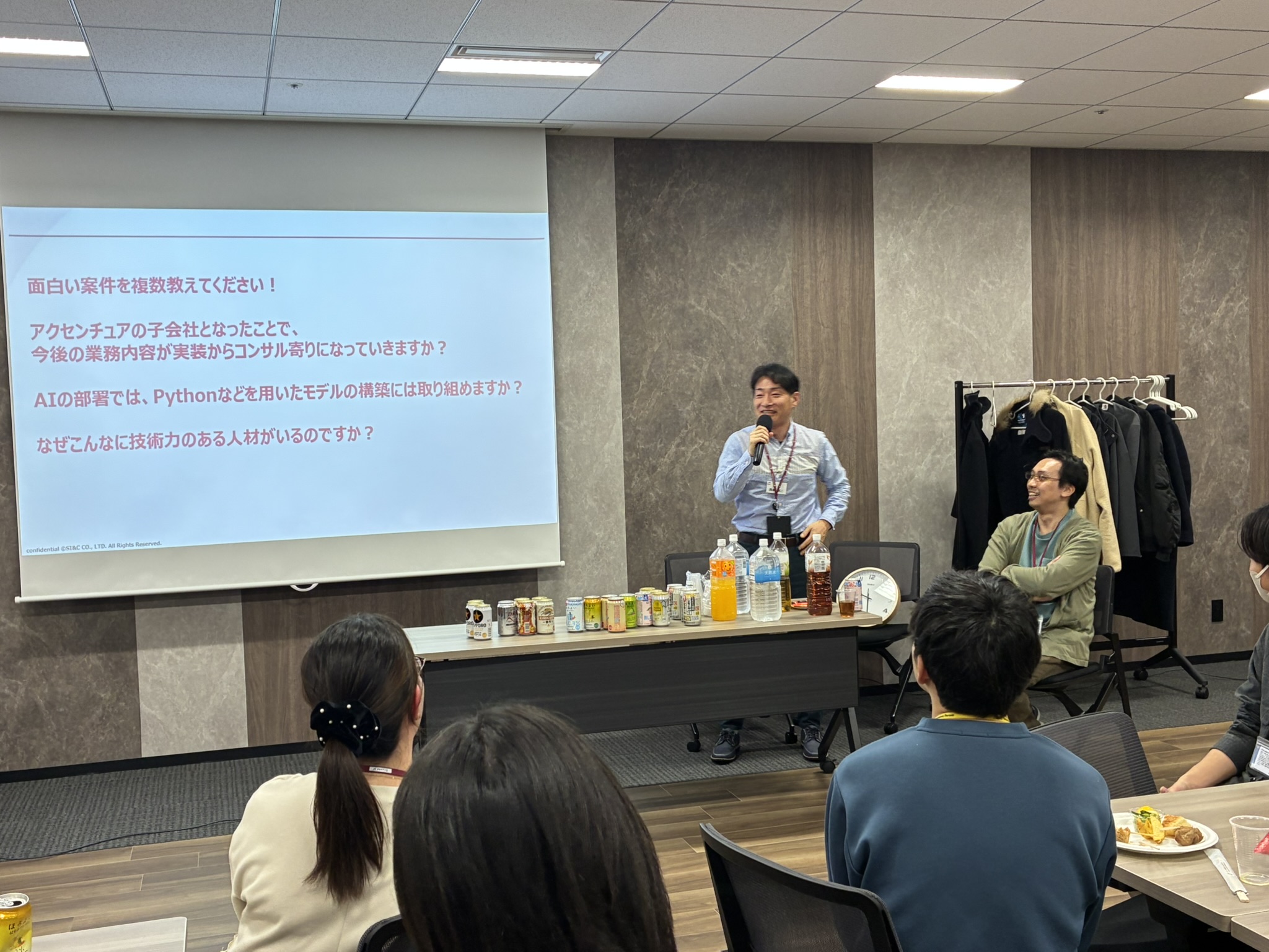 懇親会では社員とのトークセッションを実施し、学生の皆さんから集まった質問に対して実体験を交えながら回答しました。