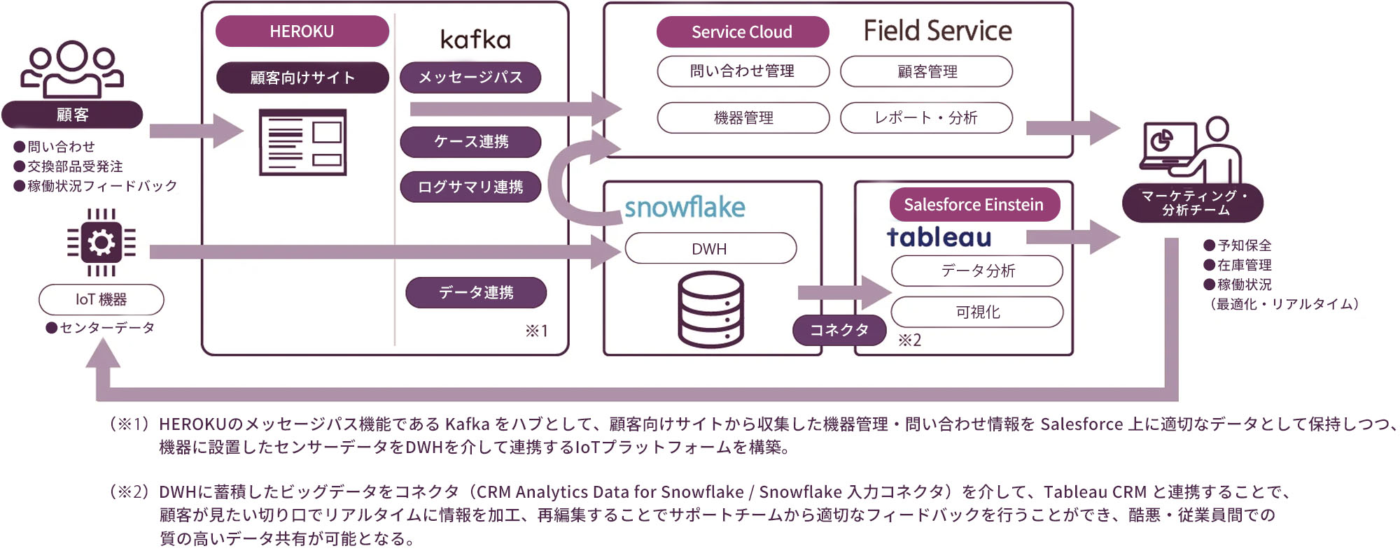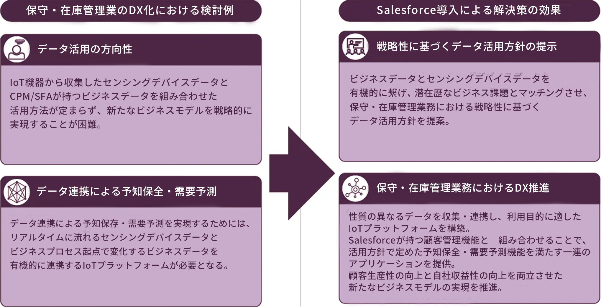 メーカーが顧客に販売しているマシンのトラブルを未然に防ぎ、顧客の生産性と自社製品の収益性向上の両立を目指した新たなビジネスモデルを実現する手段として、Salesforceを基盤としたIoTプラットフォームを提案。