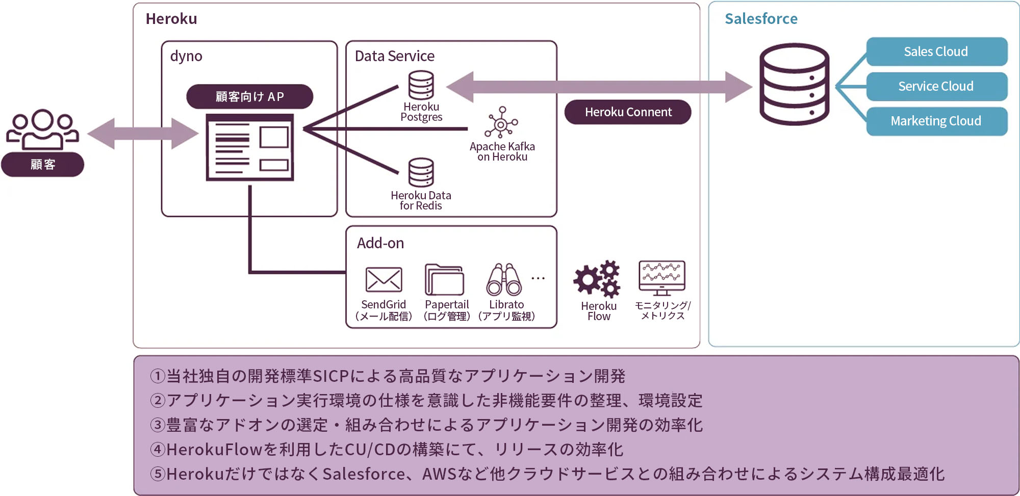 Salesforceが提供するHerokuプラットフォーム上にフルマネージドによるアプリケーション動作環境を構築し、監視や運行に必要となるAdd-onの選定や、スケール・分散ストリーミング・データベースの構築から最適化までを実施します。また、Herokuが標準対応するNode, Python, Javaなどのプログラム開発言語を用いたカスタムアプリケーションを開発し、Heroku ConnectによるSalesforceとのデータ同期を行うことでCRM/SFAとシームレスに連携するカスタムアプリケーションの開発します。
