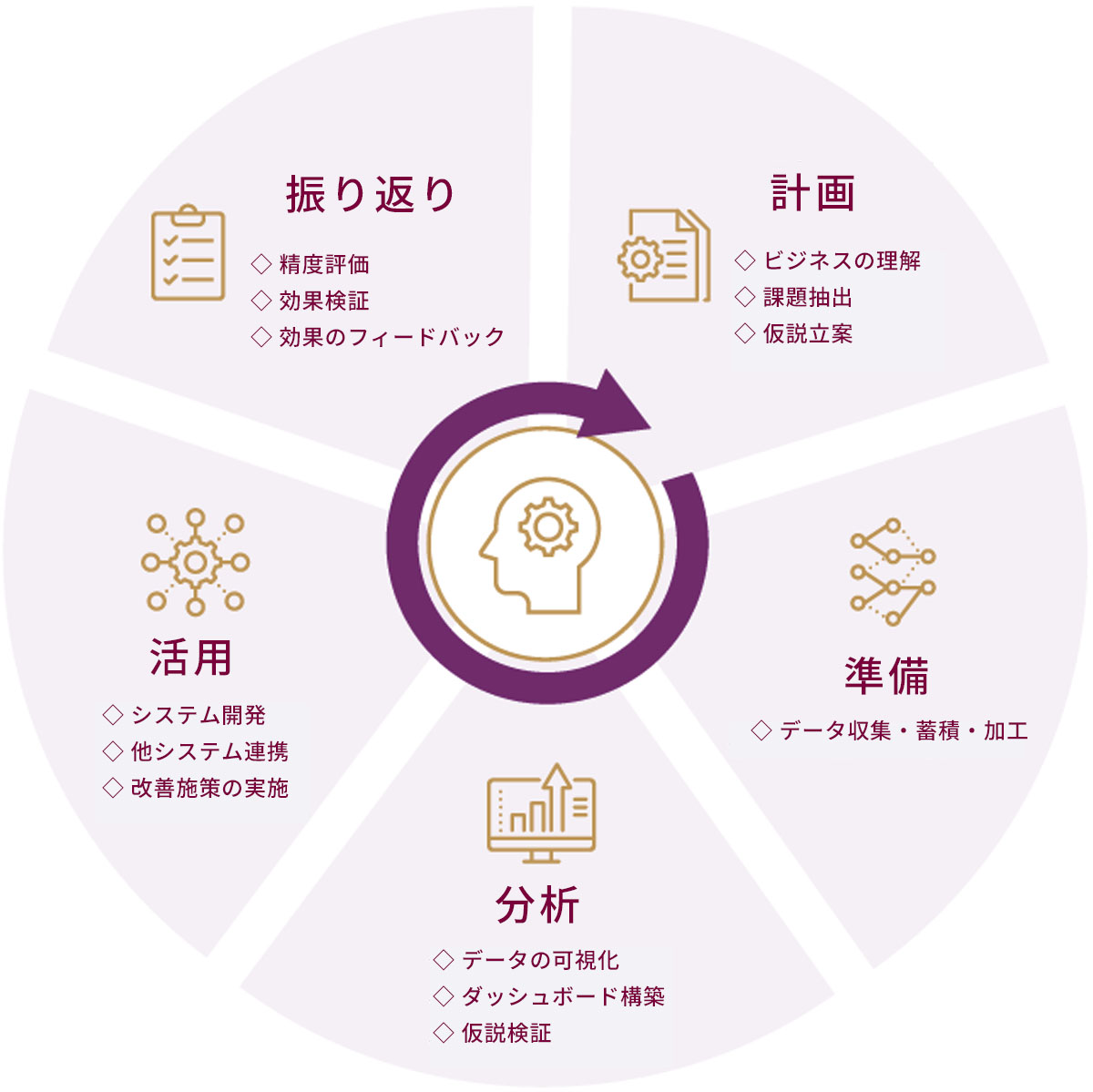 当社の考えるデータ活用プロセスでは、個々のプロセスをサイクル化することにより、一過性に留まらないデータ活用を実現します。