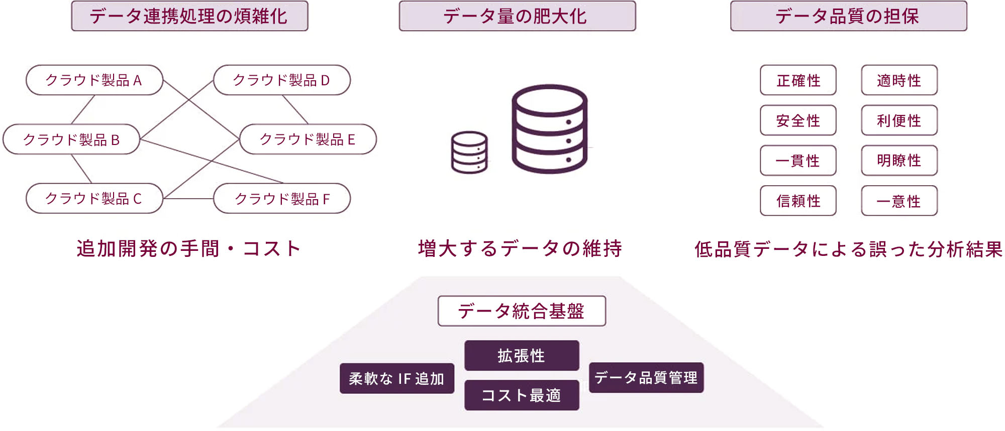 その課題解決に対し当社では、将来を見据えたデータ統合基盤のグランドデザインをご提案いたします。