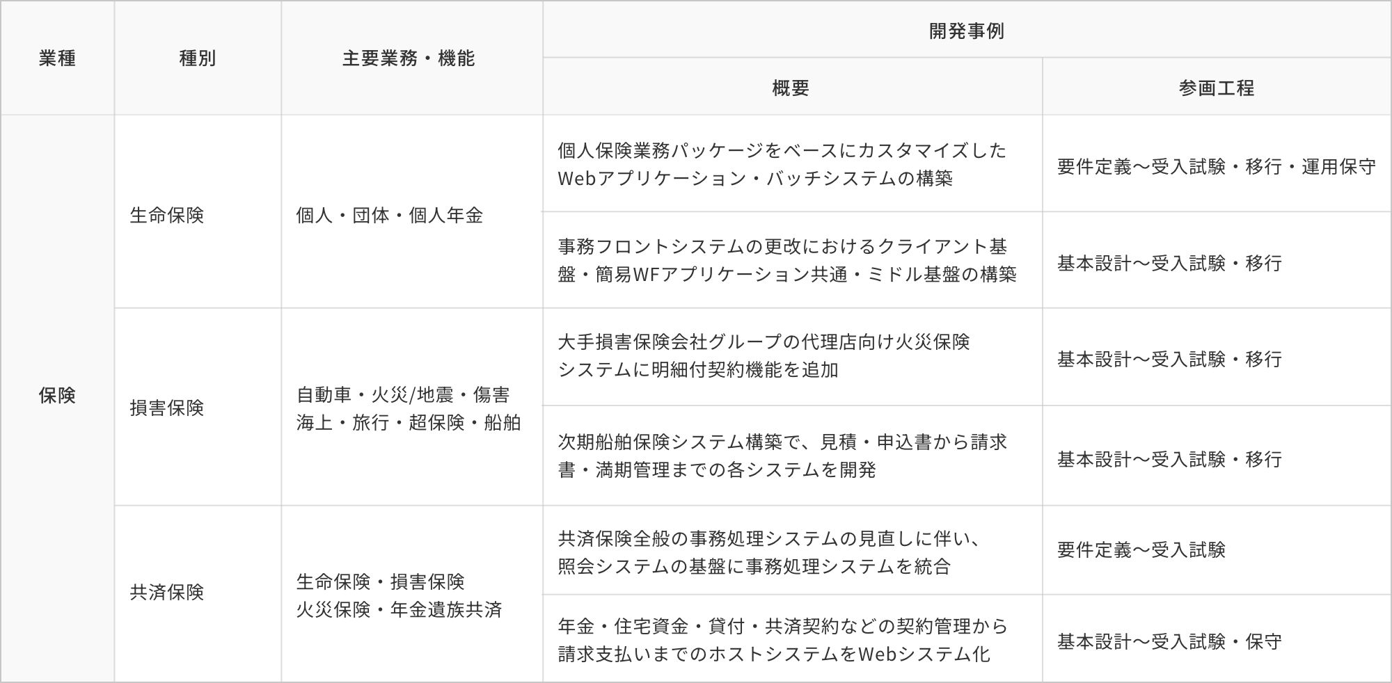 当社は長年「生命保険」「損害保険」「共済保険」と幅広い分野で保険のシステム構築・運用保守に携わっております。