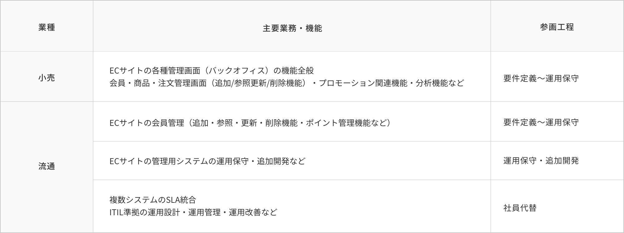 アプリケーション開発はもとより、インフラ構築・PMO・業務コンサルティングの実績もあります。