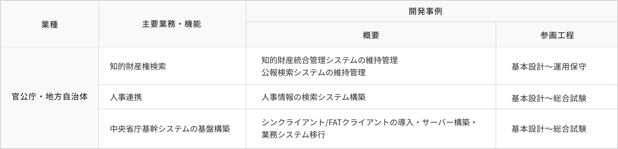 当社は、中央省庁、及び公的機関のシステム構築・法律を基にした官公庁特有業務に関連したソフトウェア開発・運用保守、及び入札案件における提案支援に携わってきております。