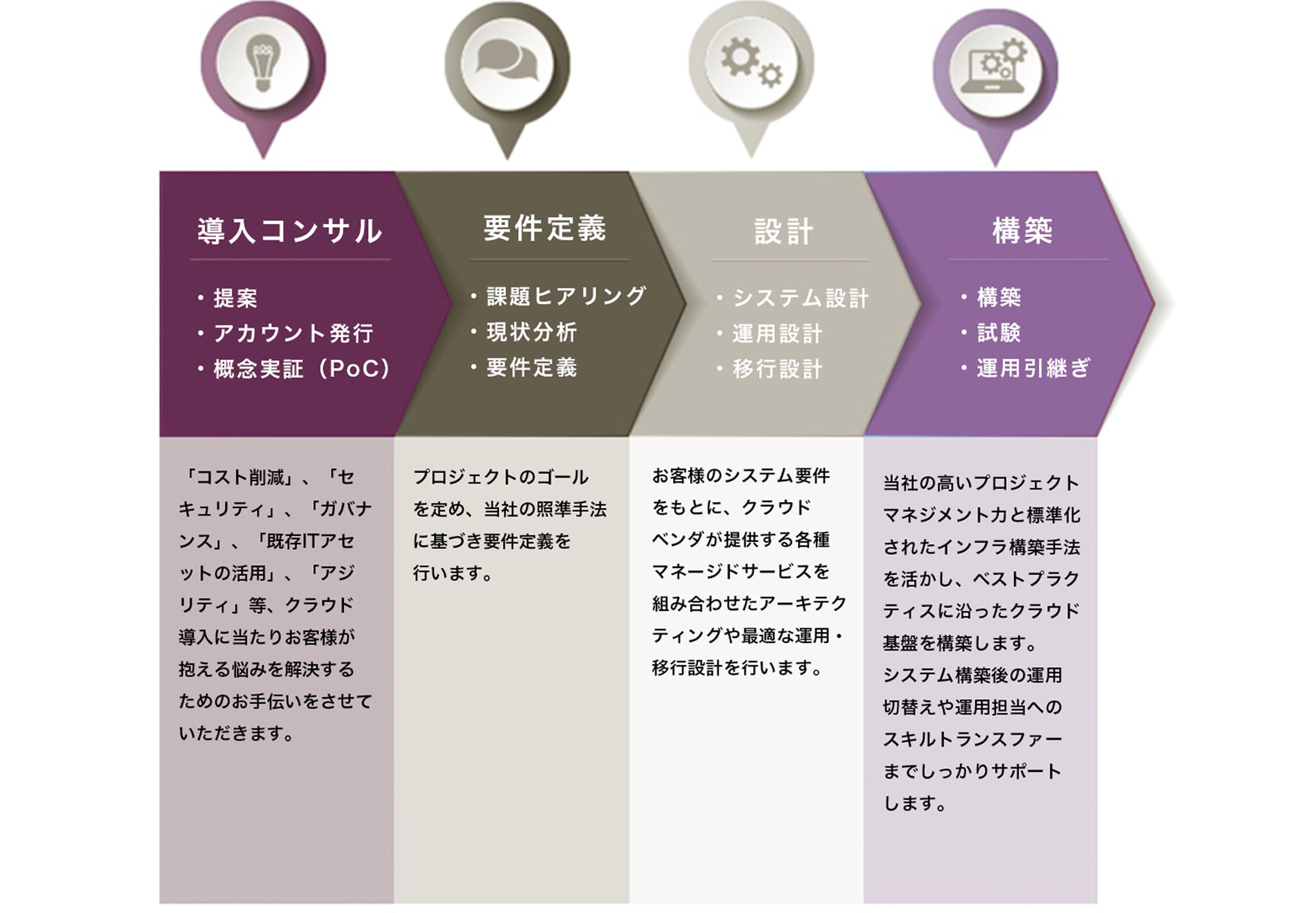 当社では、提案から構築までのクラウドサービスの導入から構築までの一貫したサポートをおこなうことができます。