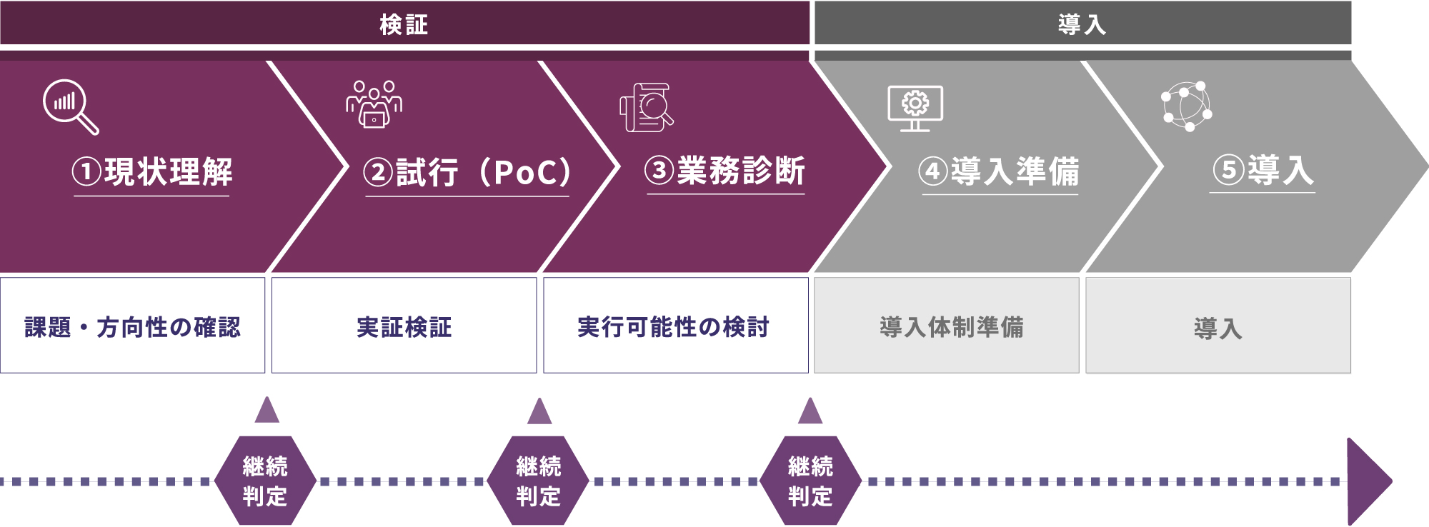 一般的に複数のシナリオを同時並行で推進することから、 単一のシナリオを成功させつつ、プロジェクトの目標を達成していくマネジメントが必要になります。当社にはこうした開発手法のマネジメント経験を有するプロジェクトマネージャーや、AIなどの先端技術を経験を持つエンジニアが多数在籍しております。社内エンジニアと各種ITベンダとのエコシステムにより、お客様のビジネスの効率化を支援いたします。