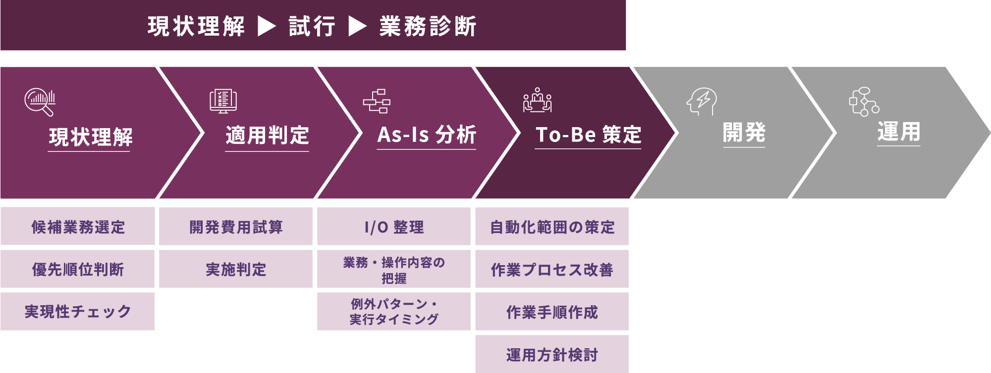 こうした判定には、ソリューションが適切であるかという点も含まれるため、代替策の検討が欠かせません。当社はRPAによる解決を主軸としながら、様々なITソリューションをもって業務改善を推進するコンサルティングを強みとしています。